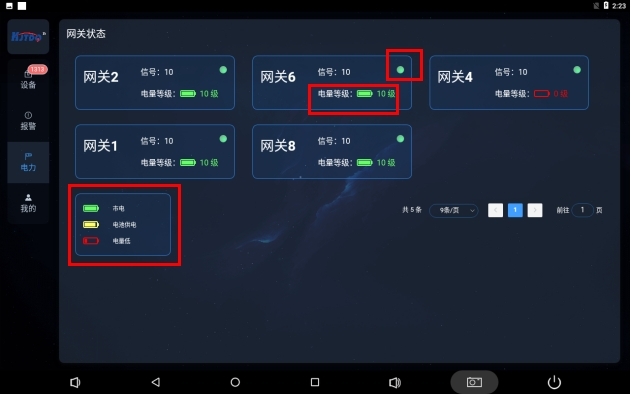 電力頁面展示整套無線系統里無線中繼器和無線智能網關的在線監護,網關設計按照業主要求的供電方式給出設計,供電組成可在市電供電,電池供電,光伏供電3種方式下自由組合和自動切換。