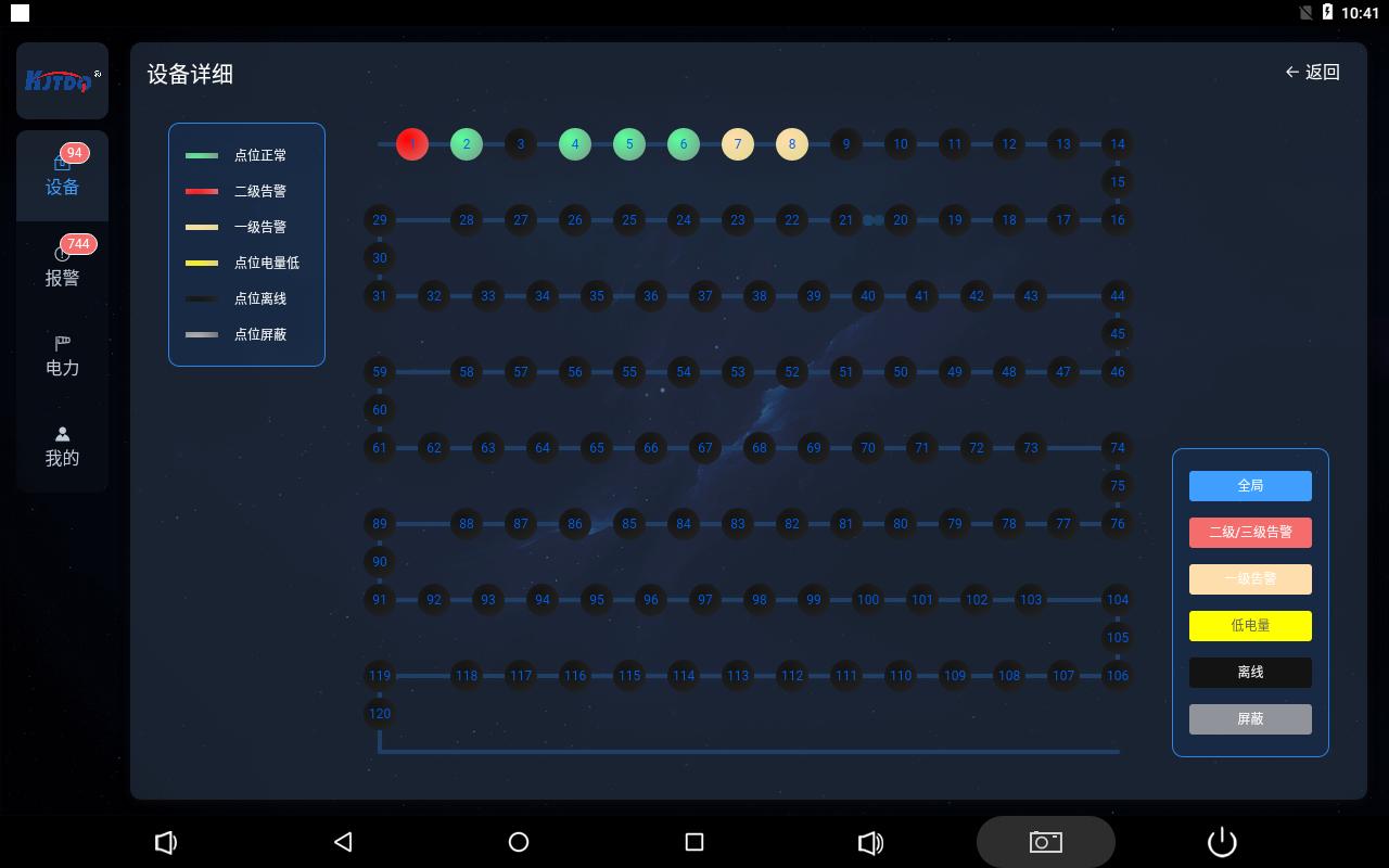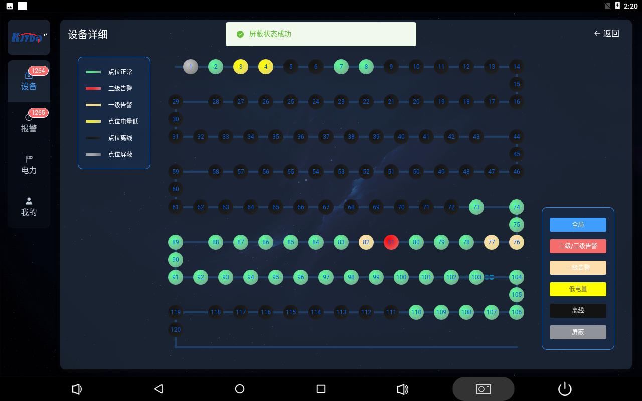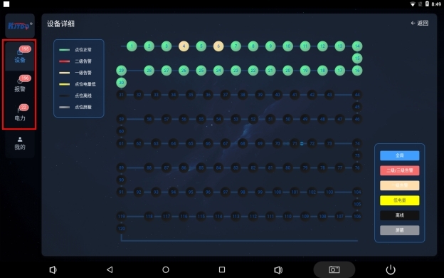 圓圈代表保護裝置,圈內數字代表保護裝置ID號,右下角6色按鈕,點擊全局正常展示所有圓圈狀態