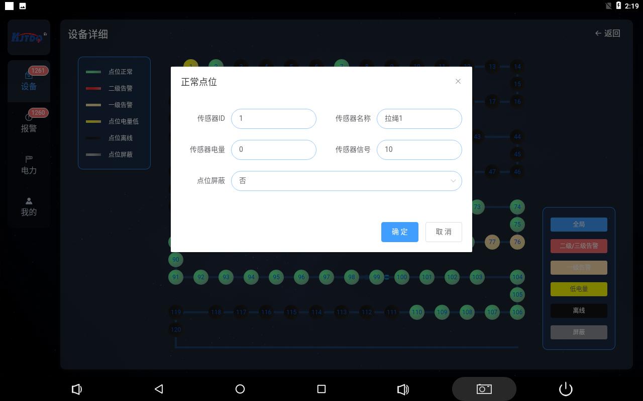 設備詳情頁實時顯示皮帶上保護裝置當前狀態鏈路圖,分為6種樣色顯示,分別代表保護裝置正常,保護裝置保護裝置二級告警,保護裝置一級告警,保護裝置電量低,保護裝置離線,保護裝置屏蔽六種狀態。