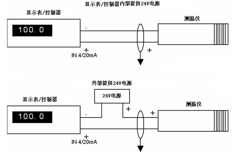對于4~20mA的模擬信號輸出。為兩線制環(huán)路電流輸出方式,其與顯示器或控制器的連接,有以下兩種典型應(yīng)用(連接法):